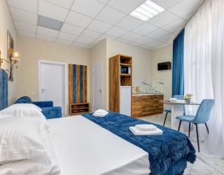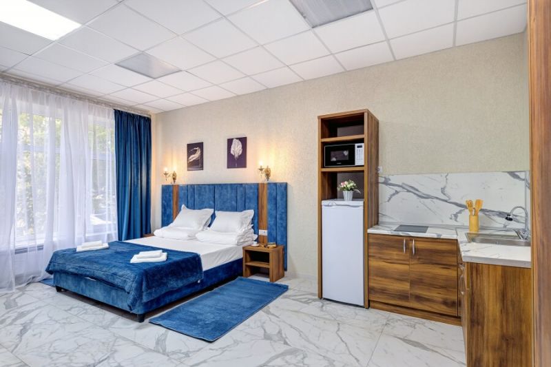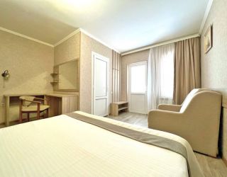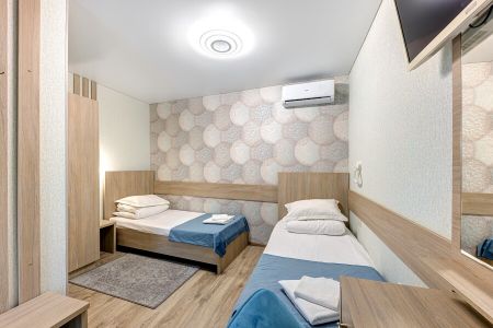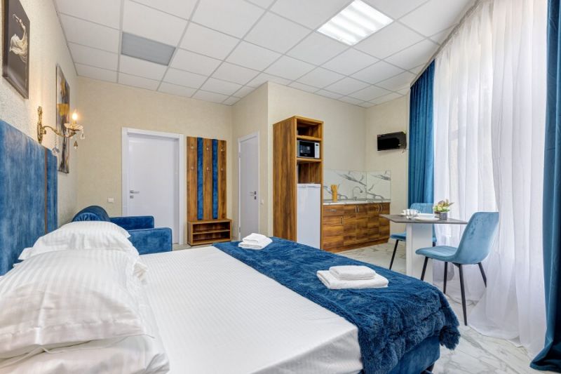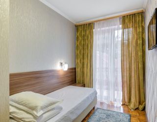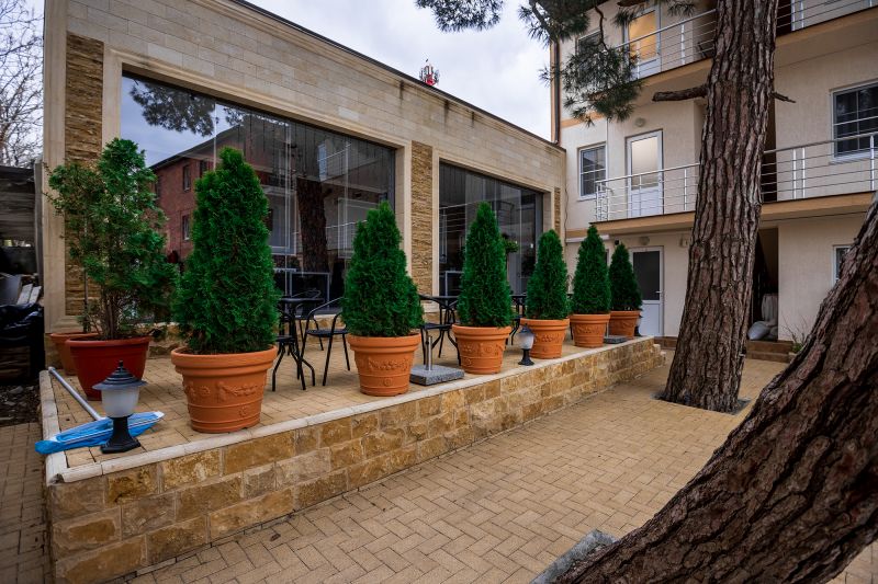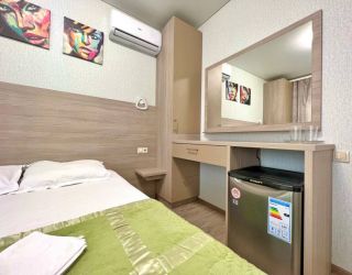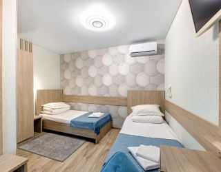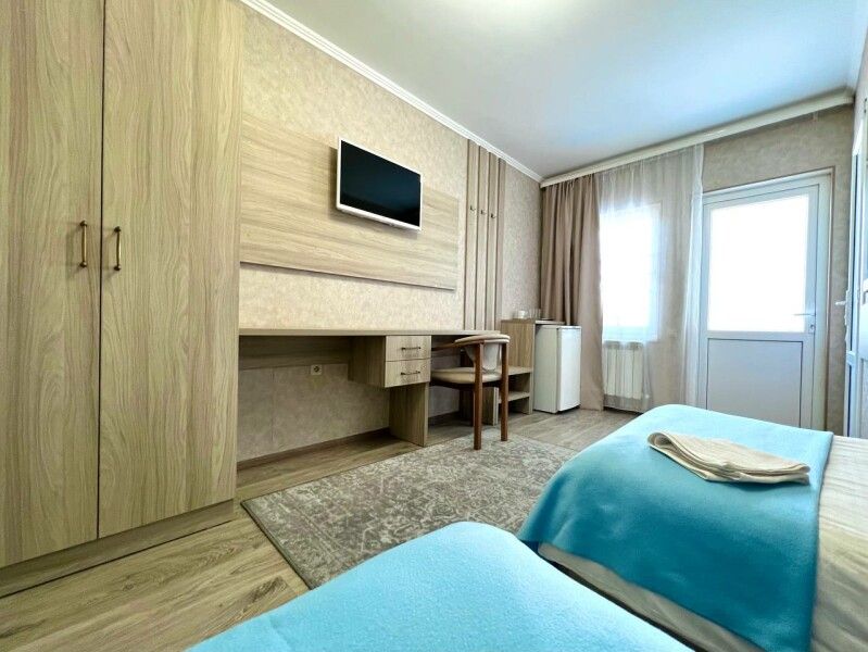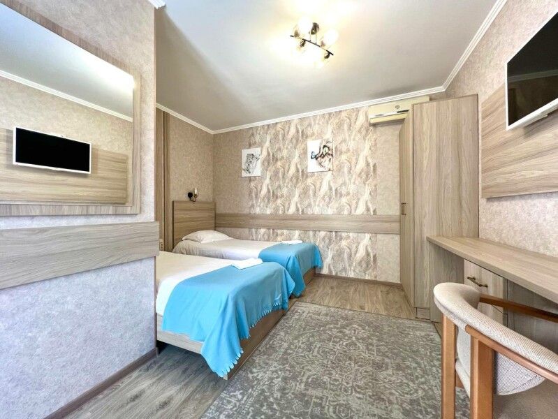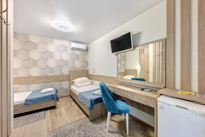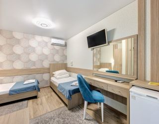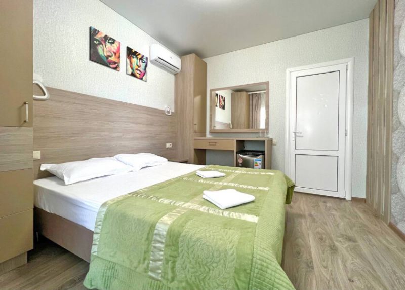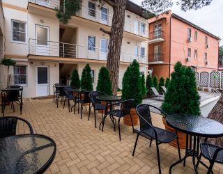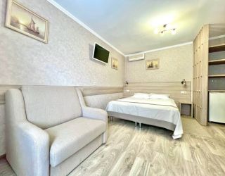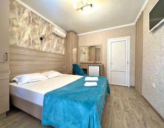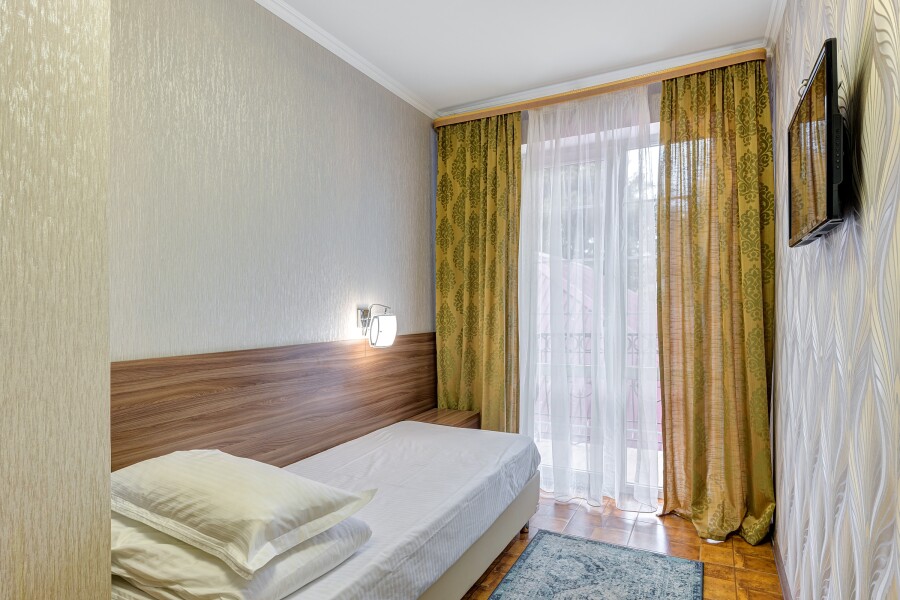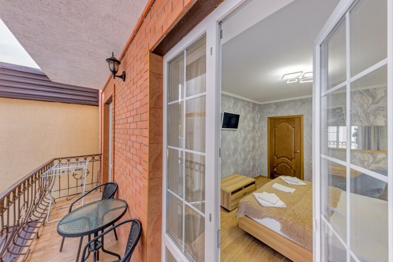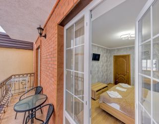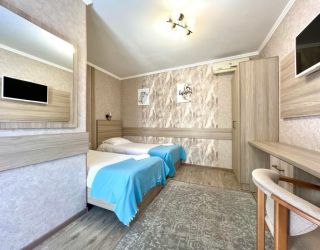 Трехэтажный корпус гостевого дома занимает благоустроенную закрытую территорию в тихом зеленом квартале. В распоряжении гостей однокомнатные и двухкомнатные номера. В каждом предусмотрен санузел, есть кондиционер, плазменный телевизор, небольшой холодильник.
