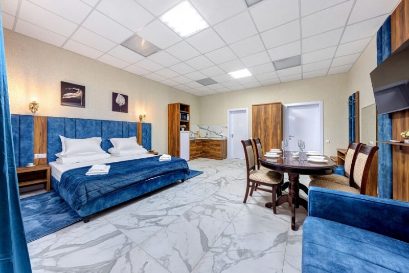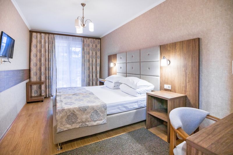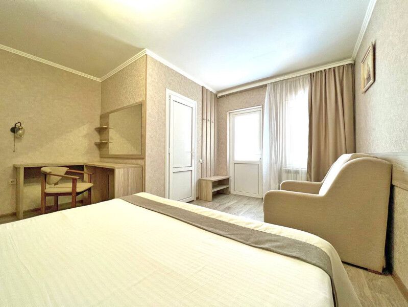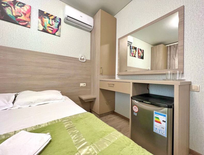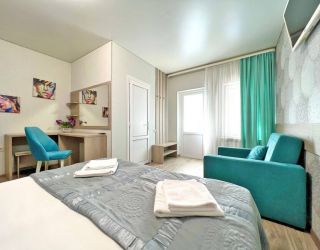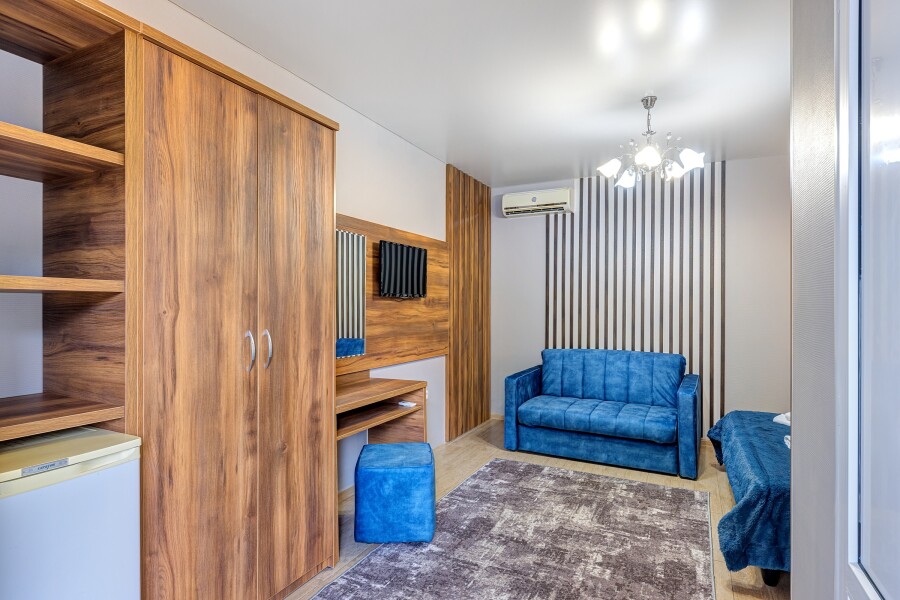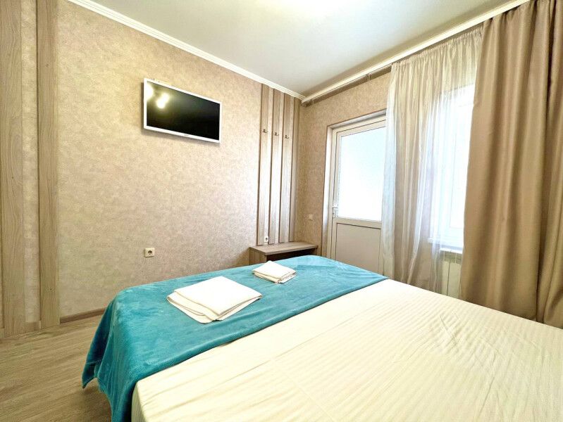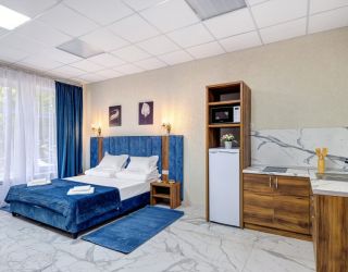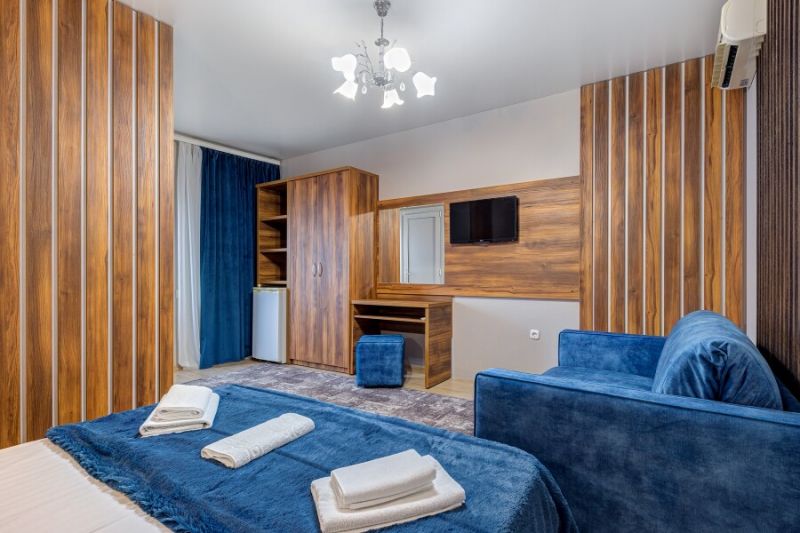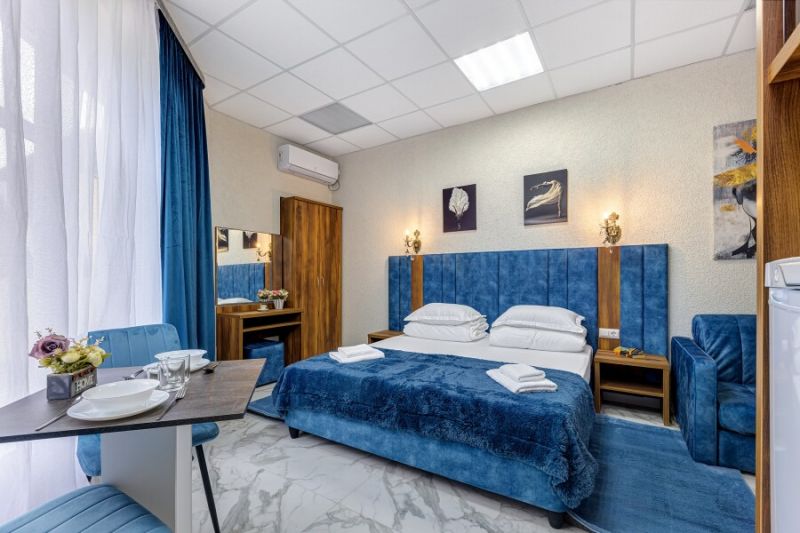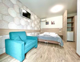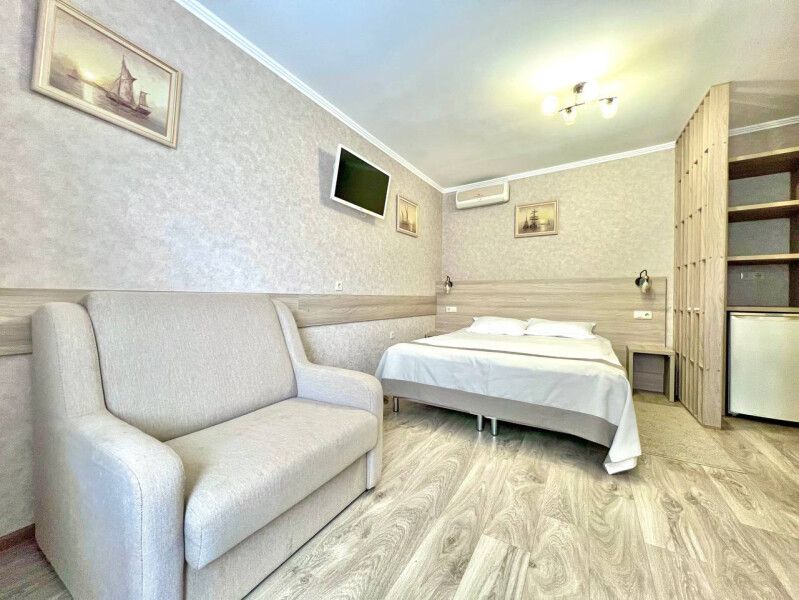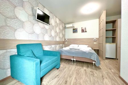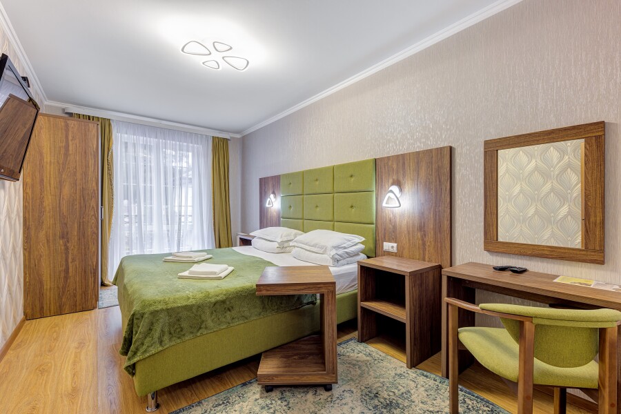 Трехэтажный корпус гостевого дома занимает благоустроенную закрытую территорию в тихом зеленом квартале. В распоряжении гостей однокомнатные и двухкомнатные номера. В каждом предусмотрен санузел, есть кондиционер, плазменный телевизор, небольшой холодильник.