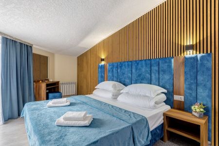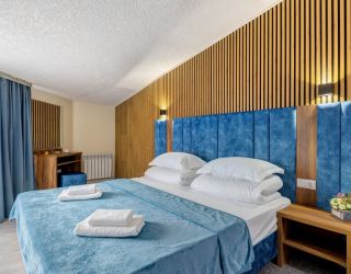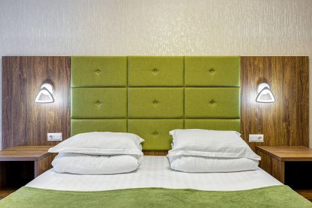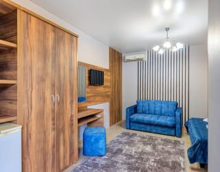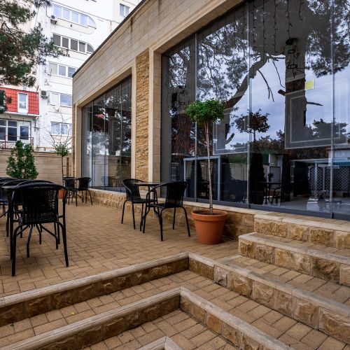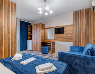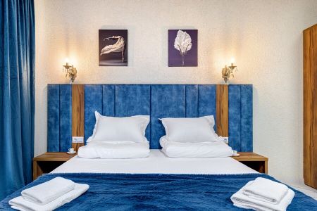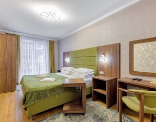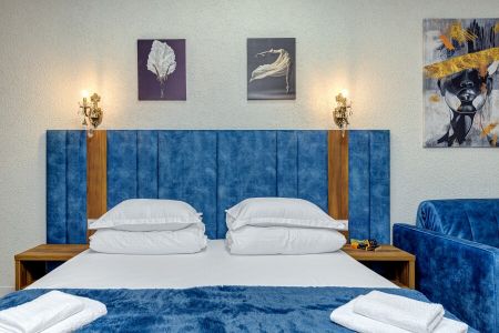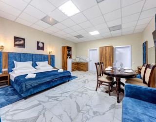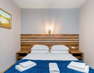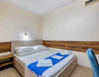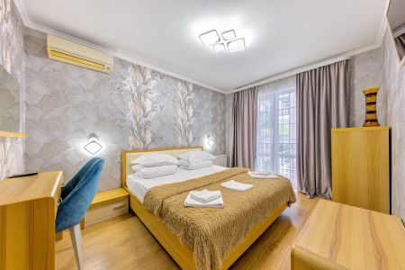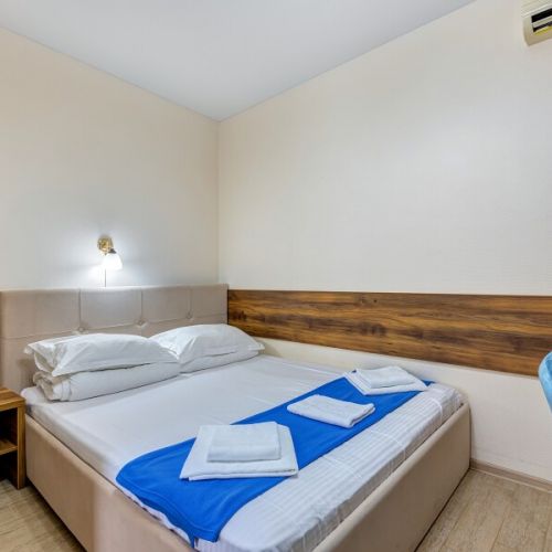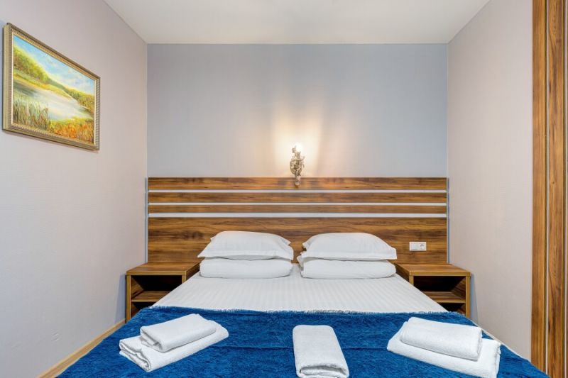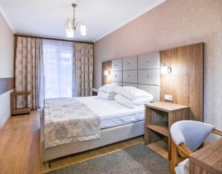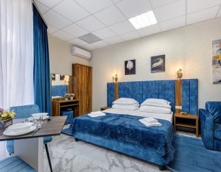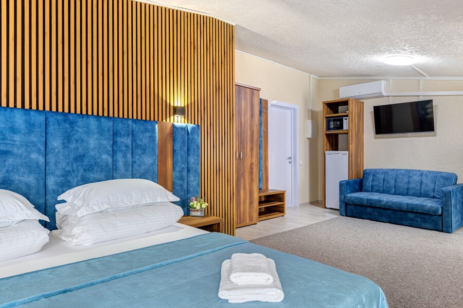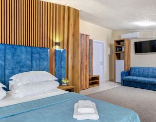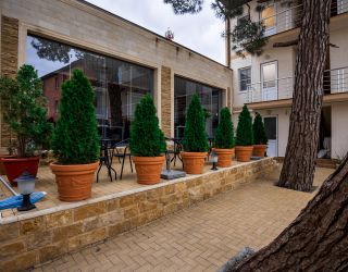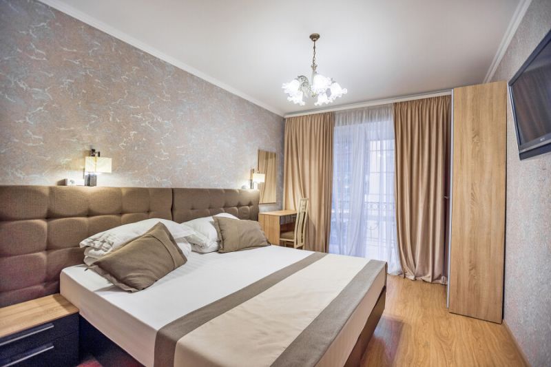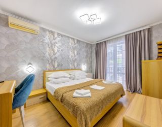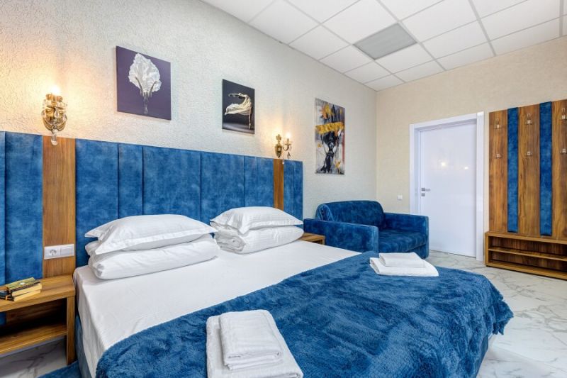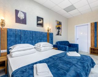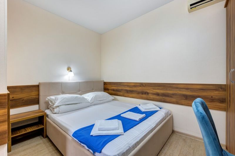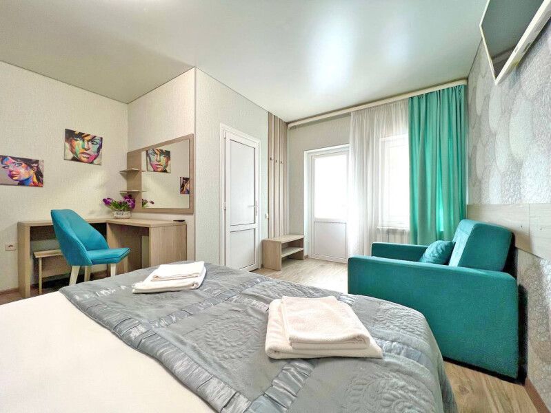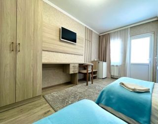 Трехэтажный корпус гостевого дома занимает благоустроенную закрытую территорию в тихом зеленом квартале. В распоряжении гостей однокомнатные и двухкомнатные номера. В каждом предусмотрен санузел, есть кондиционер, плазменный телевизор, небольшой холодильник.